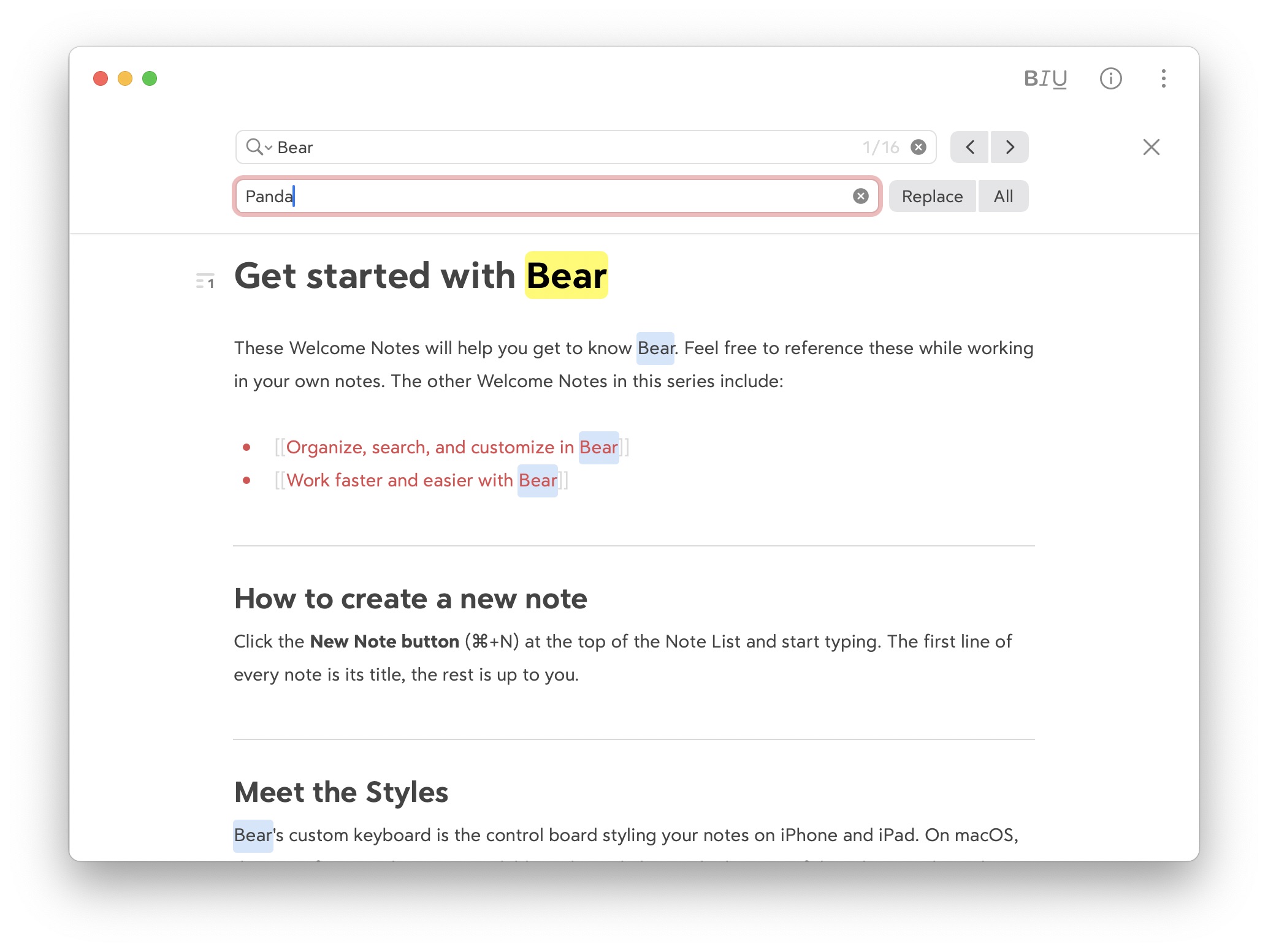 With Bear Pro, Bear can search text inside photos and PDFs attached to the note. This in-note search tool also has a Replace option to change keywords and phrases across all text in the note.